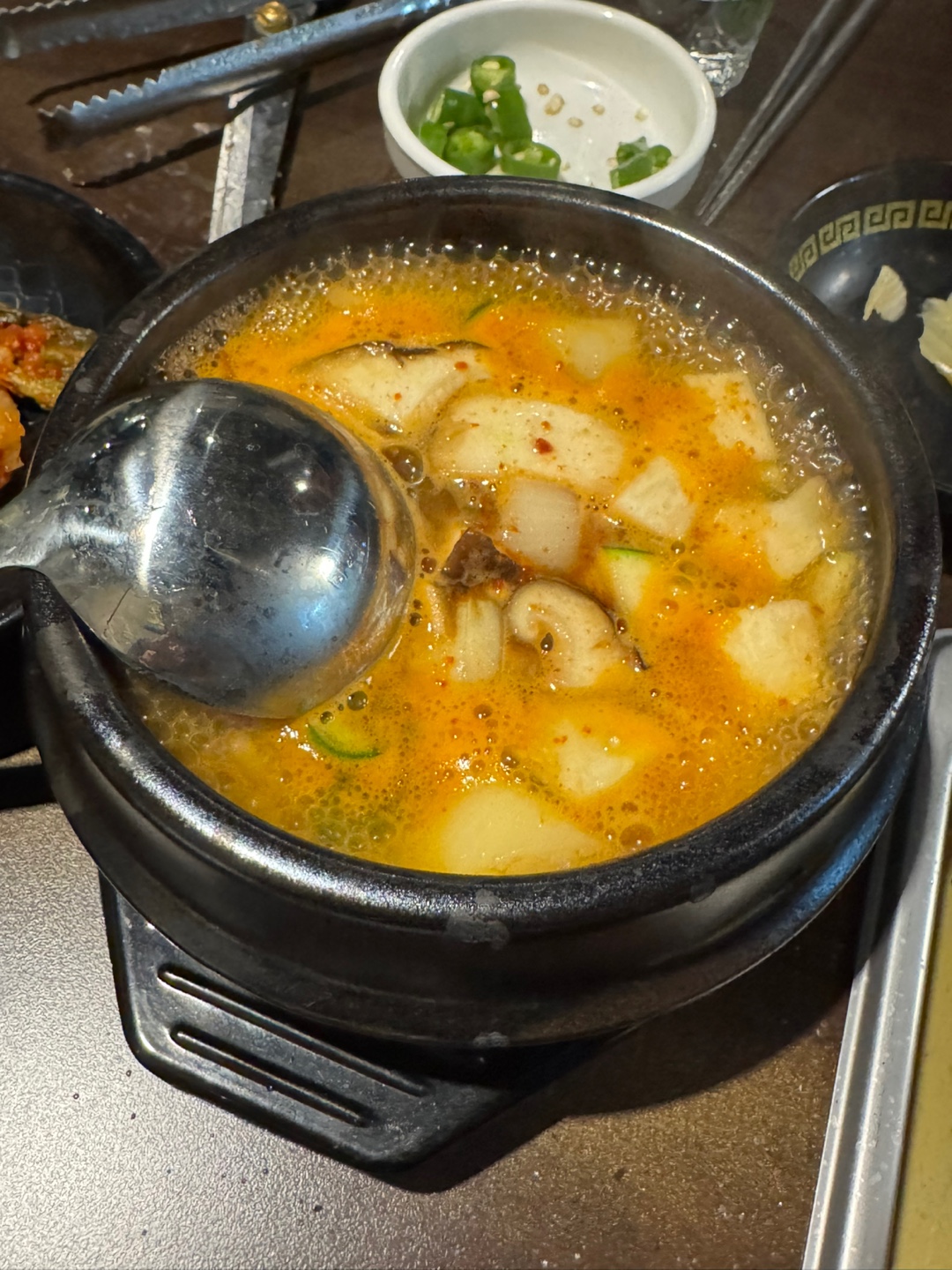 '된장찌개'는 구수하면서도 적당히 매콤한 맛으로 하양 맛집의 진가를 발휘합니다. 특히 고기를 먹은 후 입안을 개운하게 해주는 역할을 하여, 하양 맛집 '뫼산'에서 꼭 경험해봐야 할 메뉴입니다.