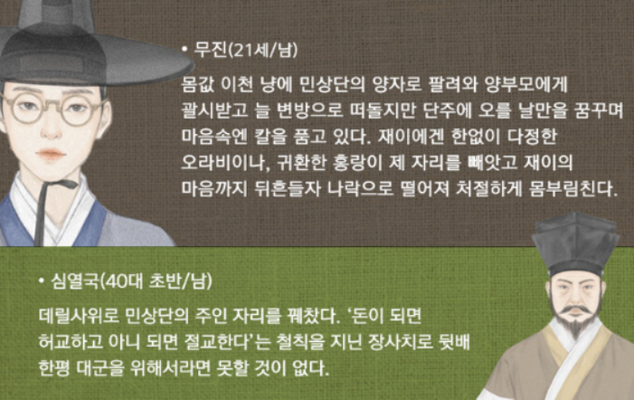 탄금 원작에서 10년이 흐른 후, 가짜 후계자 무진이 등장합니다. 탄금 원작 속 무진은 시멸국이 데려온 양반가의 아들로, 홍이 돌아올 때까지 자리를 지키는 역할을 맡았습니다.