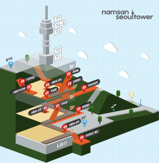 남산타워는 하층부인 서울타워플라자와 상층부인 N서울타워로 구성되어 있습니다. 남산타워 내에는 약 30여개의 점포가 있어 먹거리, 볼거리, 즐길거리까지 한곳에 모여 있습니다. 남산타워 5층부터 시작해 T1~T7층까지는 N서울타워로 전망대와 N기프트샵, 다양한 레스토랑과 카페가 위치해 있습니다.