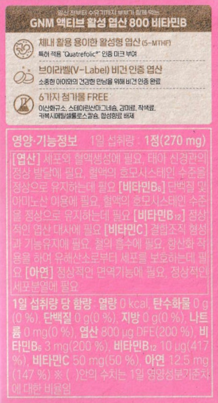 | - 활성 엽산(5-MTHF) 사용 → 체내 흡수율 높음 - 비타민 B12 포함 → 혈액 및 신경 건강 보조 - 국내 브랜드로 가성비가 우수할 가능성 높음 |
