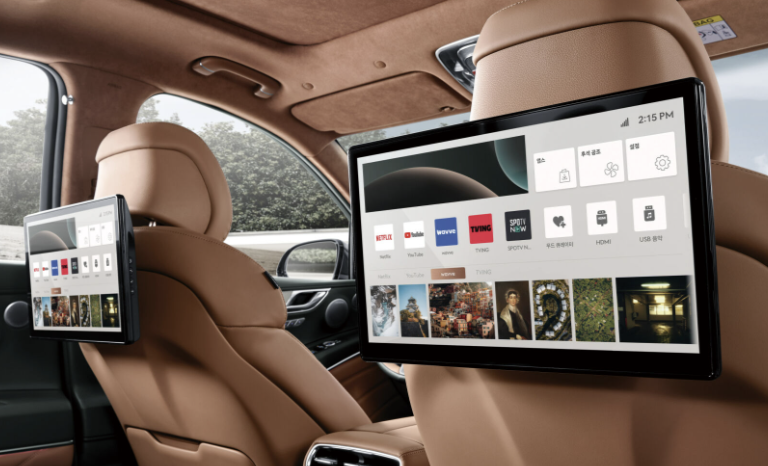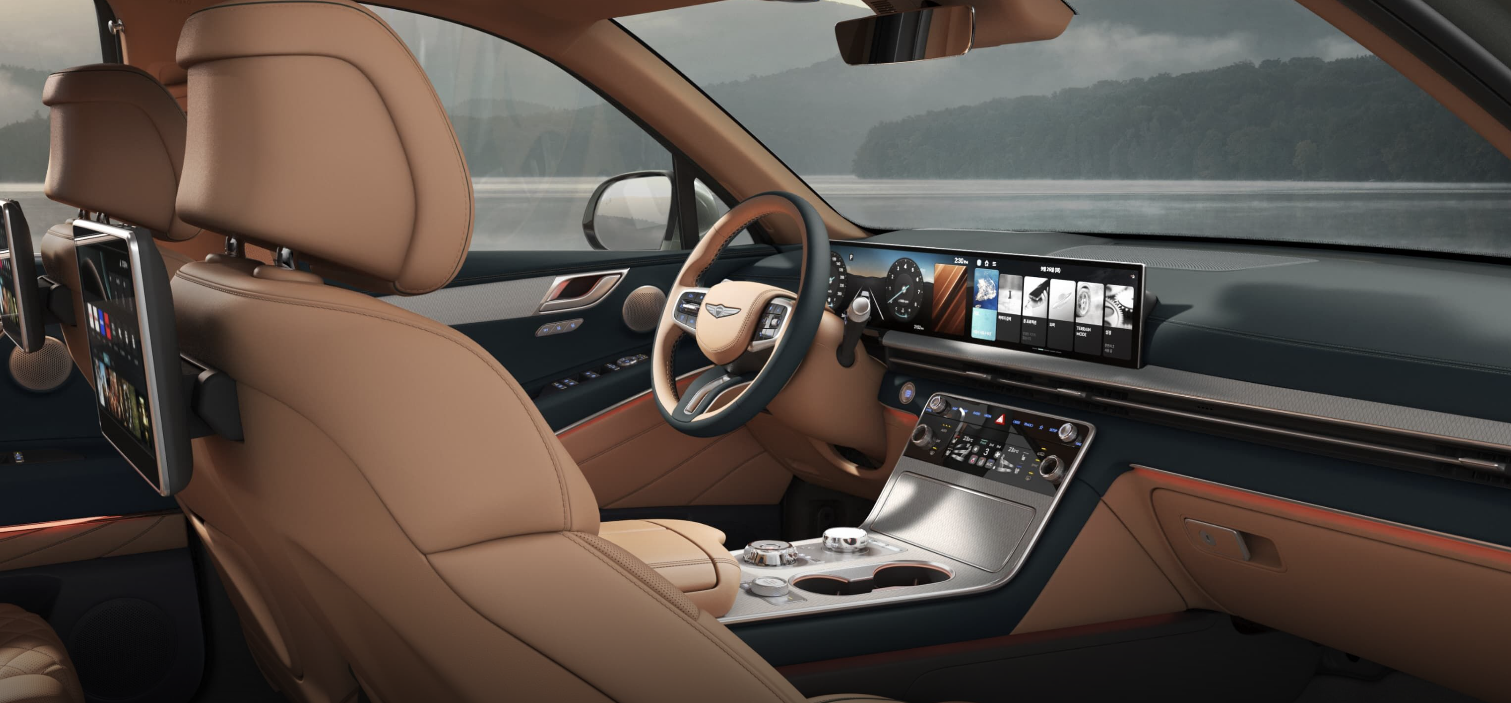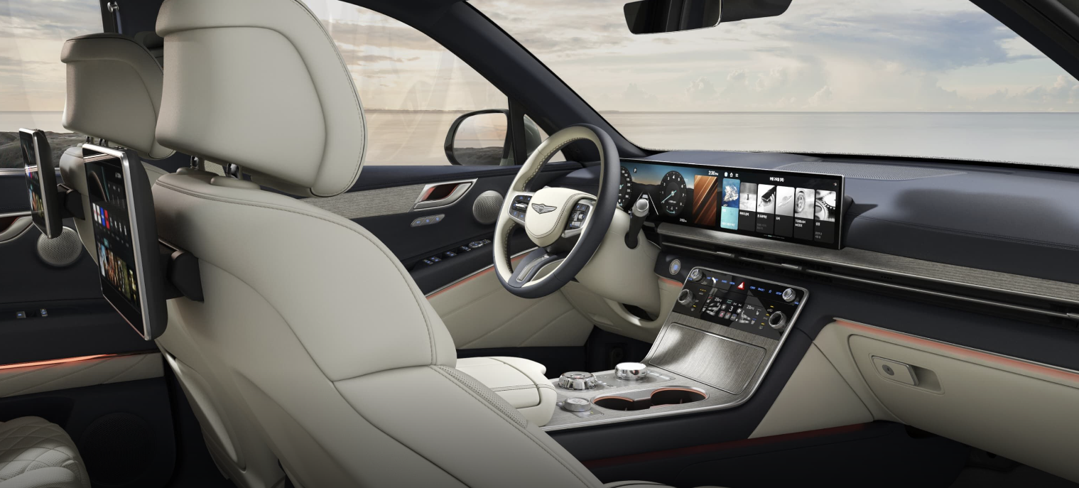 제네시스 GV80는 27인치 OLED 클러스터/내비게이션 통합형 디스플레이를 탑재하여 혁신적인 사용자 경험을 제공합니다. 분할 화면을 통해 내비게이션 지도, 미디어, 날씨, 오디오 컨트롤 등을 동시에 확인할 수 있어 운전자의 편의성을 크게 향상시켰습니다.
