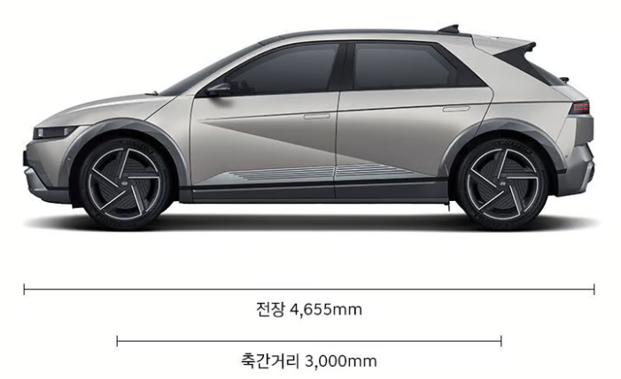 현대 아이오닉5는 전장 4,635mm, 전폭 1,890mm, 전고 1,605mm, 휠베이스 3,000mm의 크기를 가집니다. E-GMP 플랫폼의 장점을 활용한 플랫 플로어 구조로 넓은 실내공간을 확보했습니다.