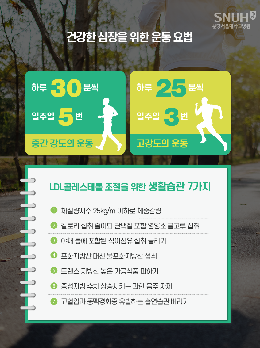 ① 건강한 식습관 : 포화지방과 트랜스지방 섭취를 줄이고, 섬유질이 풍부한 음식(과일, 채소, 통곡물)을 더 많이 섭취
